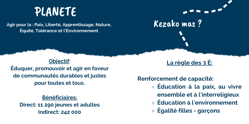 Le projet PLANETE (2023-2026) porté par les Scouts et Guides de France et leurs partenaires de Côte d’Ivoire, du Liban, du Rwanda et de Tunisie a pour objectif de créer une dynamique forte basée sur une méthode éducative commune, celle du scoutisme et du guidisme, afin d’éduquer, promouvoir et agir en faveur de communautés durables et justes pour toutes et tous.